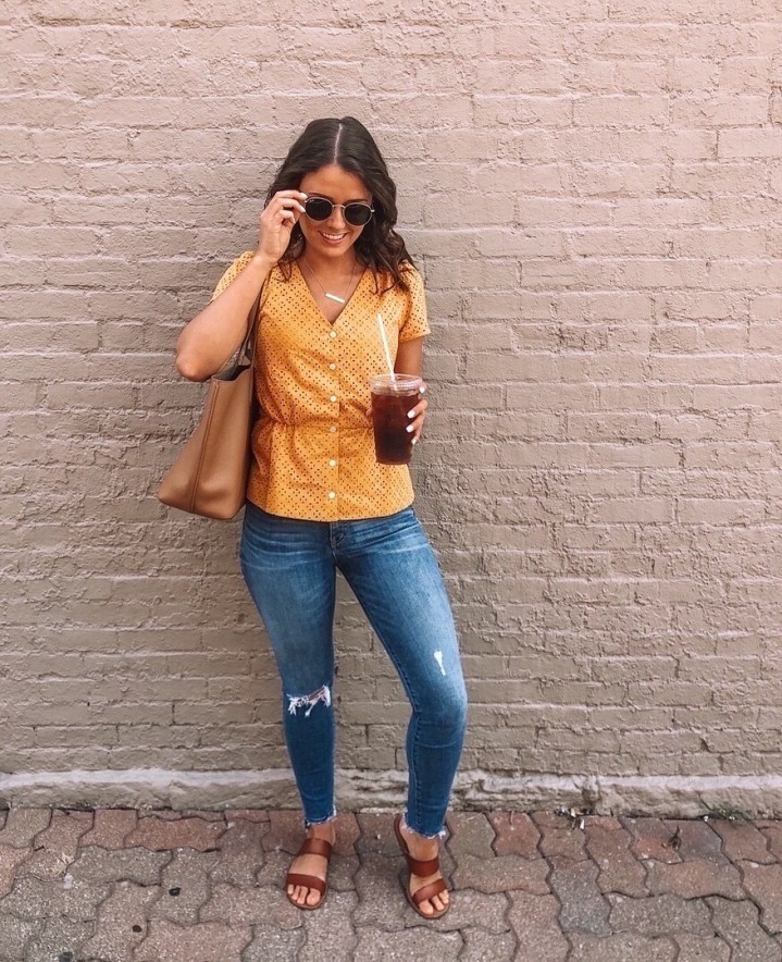 First of all, I am obsessing over yellow right now. Which is weird because it is definitely not usually my first choice. Black & white & neutrals are my go-to’s. This “Eyelet Peplum Top” comes in three colors: yellow (“bronzed topaz”), black, and white. I grabbed it in the yellow color, but I’ll be getting it in black as well! The black would be perfect with dark jeans for transitioning from day to night/dinner (just add a pair of nice earrings)! It cinches at the waist & has eyelet detailing.